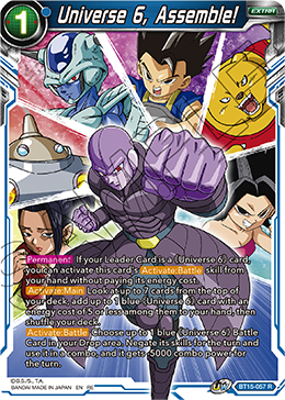 , if your Leader Card is a red <Son Goten> card and your opponent has 2 or more energy : Play this card from your hand with 2 markers on it. Draw 1 card. Choose up to 2 of your opponent's Battle Cards and they get -15000 power for the turn.