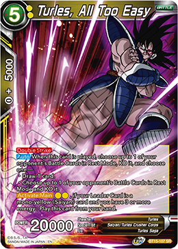 , green <Turles : Xeno> card with an energy cost of 4. When this card KOs an opponent's Battle Card, switch this card to Active Mode, then choose 1 card in your opponent's hand and discard it. When this card is removed from your Battle Area by an opponent's skill, choose all of your opponent's Battle Cards in Rest Mode, KO them, then choose all of your opponent's Battle Cards and switch them to Rest Mode.