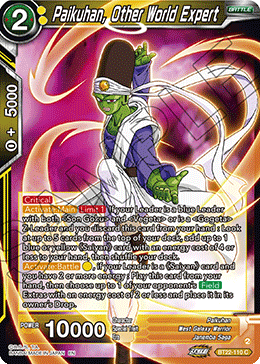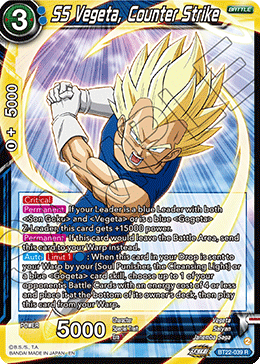 , if you have 2 or more energy : Yellow <Son Goku> card with 5000 power and blue <Vegeta> card with 5000 power. When this card is played, this card gains until the end of your opponent’s turn. If you send this card to your Warp : When this card’s skill activates, choose up to 1 each of blue or yellow <Son Goku> and <Vegeta> cards with 5000 power from your Warp, then add 1 to your hand and place 1 at the bottom of your deck.