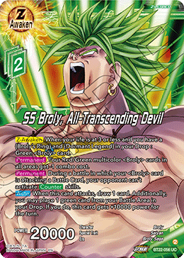 If you have a green <Broly> card in your energy or Battle Area, negate this card’s skill in all areas. Discard 1 card from your hand : When this card is played, choose up to 1 of your Leaders, and it gets +5000 power until the end of your opponent’s turn.