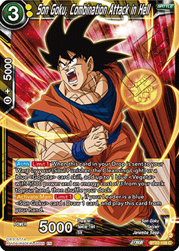 If your Leader is a blue or yellow 《Saiyan》 card, reduce the combo cost of this card by 1. When this card is played, choose up to 1 of your opponent’s Battle Cards and switch it to Rest Mode, then choose up to 1 of your opponent’s Battle Cards with an energy cost of 5 or less and place it at the bottom of its owner’s Deck. , if your Leader is a blue or yellow 《Saiyan》 card, you have 3 or more energy, and you have a Z-Card in your Battle Area : Draw 1 card and play this card from your hand.