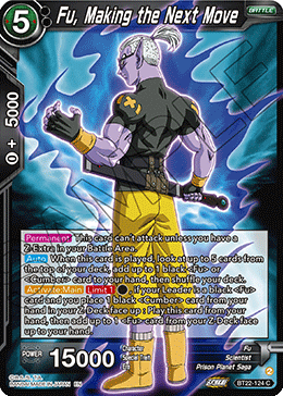 Black <Cumber> Battle Card. During your turn, once per turn, this card can’t be removed from your Battle Area by your opponent’s skills. If your Leader is a black <Fu> card : Look at up to 5 cards from the top of your deck, place up to 1 black <Fu> or <Cumber> card in your Z-Deck face up, then shuffle your deck.