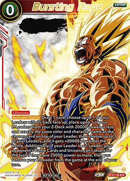 Draw 1 card, choose up to 1 of your Leaders with its back face up, place up to 1 of your Z-Leaders from your Z-Deck with 20000 power or less and exactly the same color and character name as the chosen card on top of your Leader, then choose up to 1 of your Leaders, and it gets +20000 power for the battle. Additionally, if your Leader is a Z-Leader, your opponent’s Battle Cards and Unisons can’t attack for the turn if they have 25000 power or more, then you remove your Z-Leader from the game at the end of your turn.