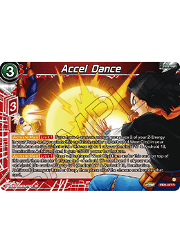 {Time Machine Departure} or {Accel Dance}. If your Leader is a red <Son Gohan : Future> or <Gohanks : Xeno> card or a red card with both <Android 17> and <Android 18>, reduce the energy cost of this card in your Z-Deck by 5. Place 1 red 《Saiyan》 or 《Android》 card from your hand under this card : Draw 1 card.