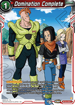 When this card is played, look at up to 7 cards from the top of your deck, then place up to 1 red <Android 17> or <Android 18> card among them under a {Destroyed West City} in your Battle Area, then shuffle your deck. If you have 3 or more energy : When this card is KO’d by one of your 《Android》 card’s skills, play up to 1 <Android 17> or <Android 18> card-both with an energy cost less than or equal to your current energy and no keyword skills-from under a {Destroyed West City} in your Battle Area.