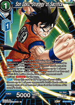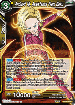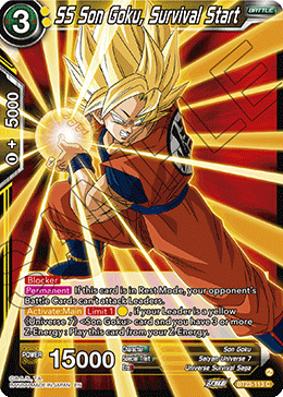 If your Leader is a yellow 《Universe 7》 <Son Goku> card : Play this card, and if the Battle Card being played has an energy cost of 7 or less, play it in Rest Mode. If you have 6 or more Z-Energy, reduce the energy cost of this card in your hand by 2. If your Leader is a yellow 《Universe 7》 <Son Goku> card and you have a 《Universe 7》 card in your Combo Area : When this card is added to Z-Energy, draw 1 card.