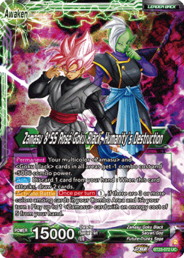 If your Leader is a <Zamasu> or <Goku Black> card, negate this card’s skill in all areas. Place 1 of your <Goku Black> cards at the bottom of your deck : Draw 1 card, and at the end of the turn, switch up to 1 of your energy to Active Mode. [Activate : Battle], if your Leader is a <Zamasu> or <Goku Black> card and there are 1 or more <Zamasu> and <Goku Black> cards in your Combo Area : Play this card from your hand.