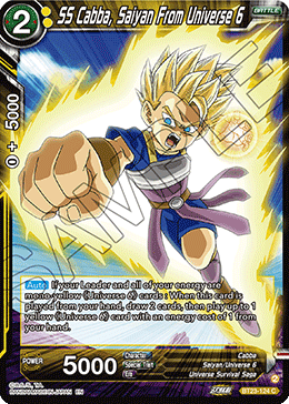 If your Leader and all of your energy are mono-yellow 《Universe 6》 cards : When this card is played from your hand, draw 2 cards, then play up to 1 yellow 《Universe 6》 card with an energy cost of 1 from your hand.