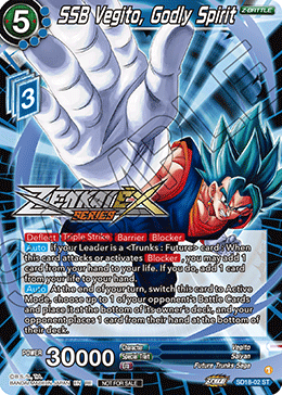 If you don't have a Unison in play : When this card is played, play up to 1 {SSB Vegeta, Committed to Victory} from your deck with a marker on it, then shuffle your deck. , if this card is in a battle and 1 or more mono-blue cards are in your Combo Area : Draw 1 card, and this card gets +15000 power and for the battle.