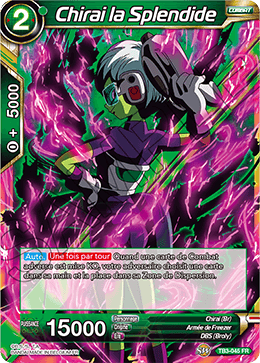À la fin de votre tour, choisissez jusqu’à une 《Armée de Freezer》 rouge avec un coût d’énergie de deux depuis votre main et jouez-la. Si vous avez joué une carte avec cette Capacité, piochez une carte.