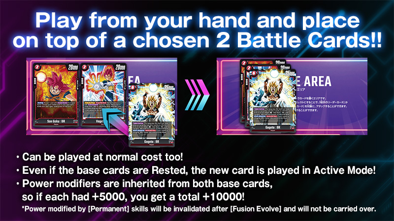 A card with [Fusion Evolve] can be played in Active Mode from your hand by stacking it on top of two specified Battle Cards with equal power