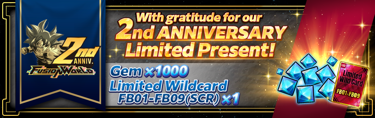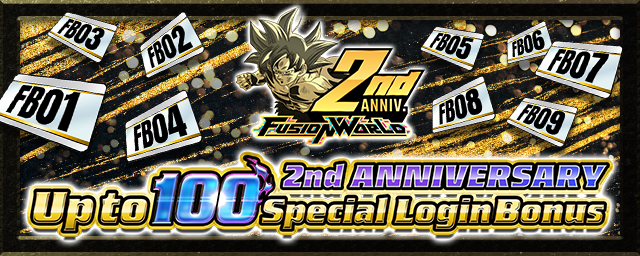 To celebrate the 2nd ANNIVERSARY of 'the digital version of Dragon Ball Super Card Game Fusion World', we will be holding the '2nd ANNIVERSARY Up to 100-Pull Login Bonus' event!
