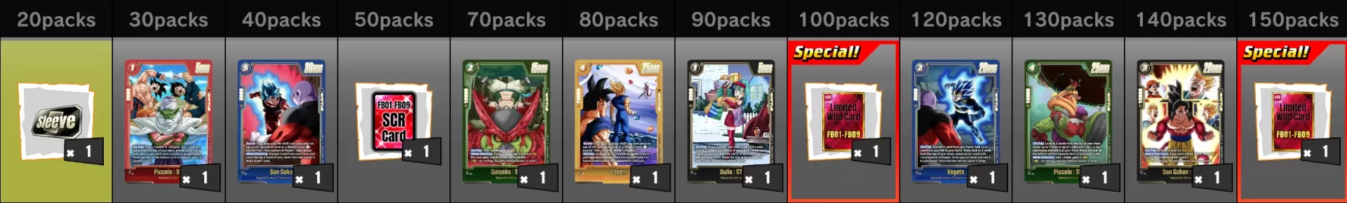 Based on how many "BOOSTER PACK DUAL EVOLUTION [FB09]" you purchase, you can earn bonus rewards including "Card Sleeve Exchange Ticket" and "Limited Wildcard FB01-FB09 (SCR)", plus up to 8 Alt-Art Cards such as "FB09-105★ Son Gohan : GT" and more!