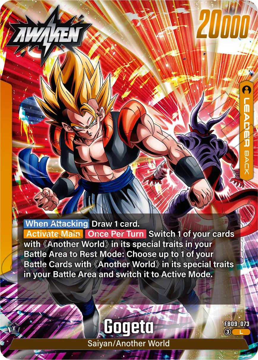 When awakened, you become "Gogeta", and once per turn, you may Rest 1 card in your Battle Area with the special trait "Another World", then choose up to 1 Battle Card in your Battle Area with the special trait "Another World" and switch it to Active!