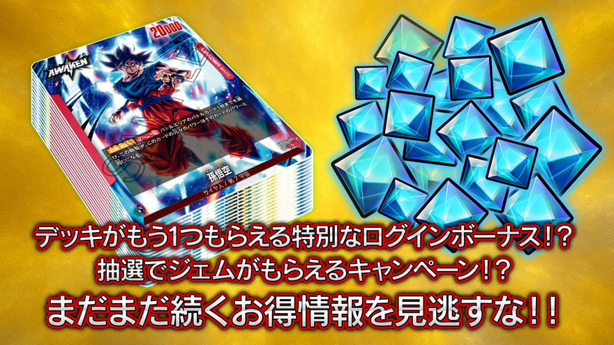 最大350ジェムに加えて、『ガンガンバトれる!構築済みデッキ』をさらにもう1つもらえるログインボーナス!