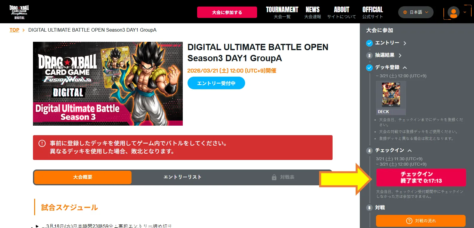 「デッキ登録」と「チェックイン」を行い、二次抽選に参加をすることで当日参加のチャンス!
